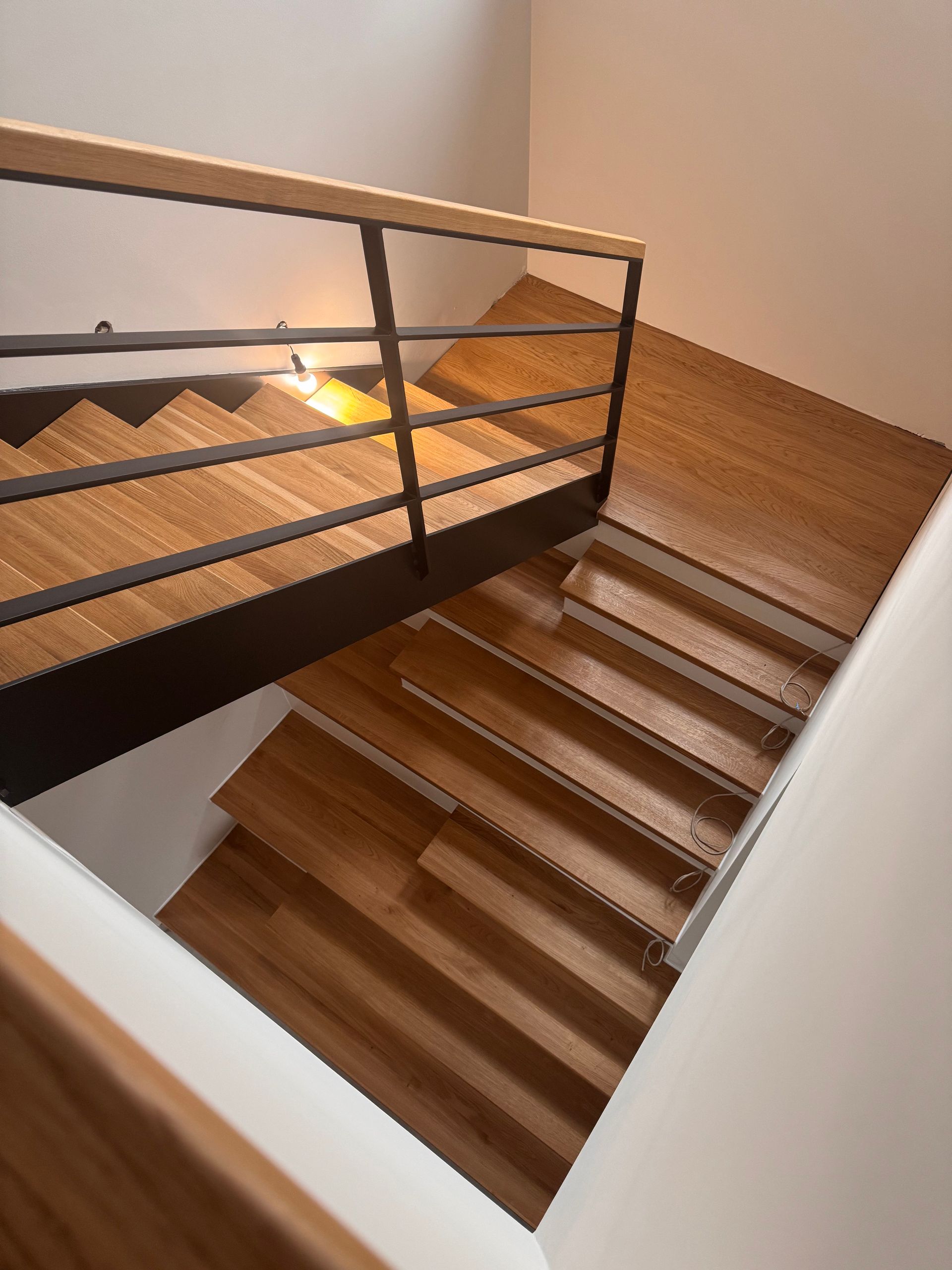 Treppen aus Stahl-Holz-Kombinationen, Massivholztreppen, Stufen auf Beton mit